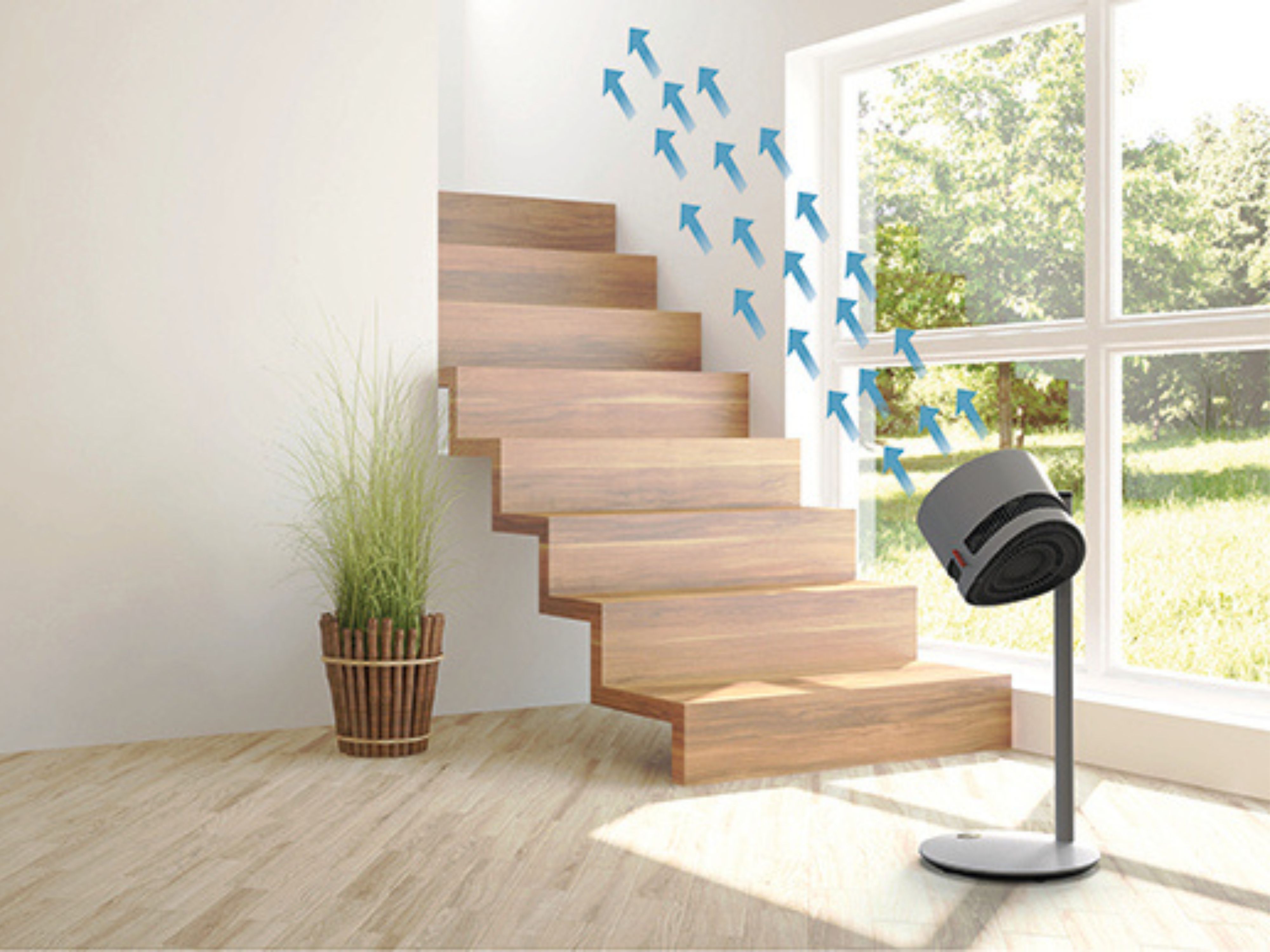 Quạt đối lưu hiện đại ngày nay không chỉ đơn thuần là tạo gió mà còn được thiết kế với khả năng xoay linh hoạt để đáp ứng nhu cầu đối lưu phức tạp của không gian nhiều tầng như căn hộ duplex. Điển hình là dòng quạt đối lưu BONECO với đầu quạt có thể xoay tới 270 độ, cho phép người dùng điều chỉnh hướng gió chính xác theo từng kịch bản vận hành. Nhờ khả năng xoay rộng này, quạt có thể dễ dàng đặt ở tầng thấp, hướng chéo lên trên để tạo vòng tuần hoàn ngang–cắt dọc, giúp phá vỡ sự phân lớp không khí vốn thường gặp trong phòng khách thông tầng. Đồng thời, nếu bố trí ở khu vực mezzanine, đầu quạt có thể linh hoạt hướng xuống để kéo lớp khí ấm, ẩm hoặc ô nhiễm từ trên cao hạ xuống, tạo sự cân bằng nhiệt và chất lượng không khí giữa các tầng.