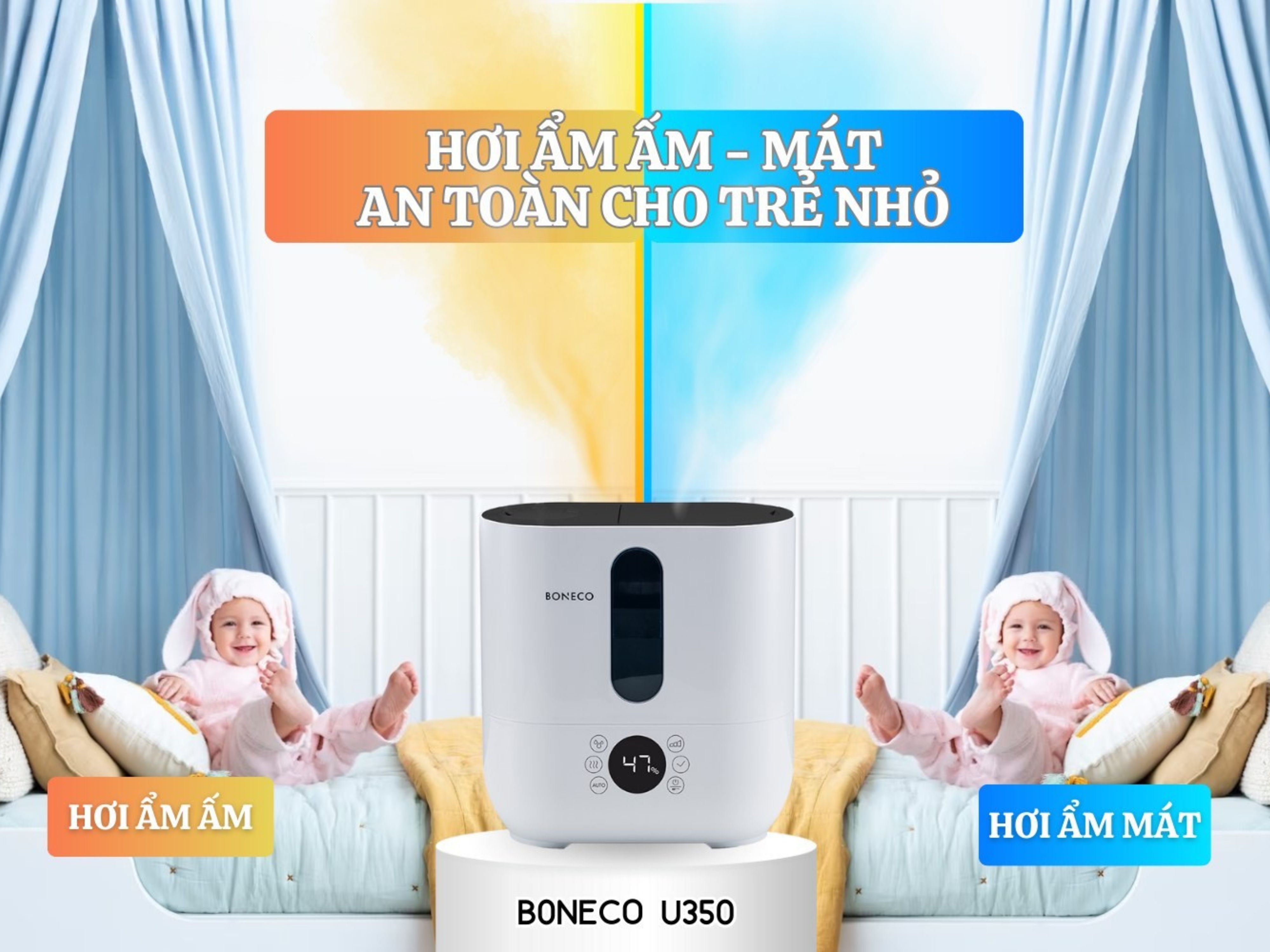 Một đại diện tiêu biểu trong phân khúc cao cấp là máy tạo ẩm BONECO U350, sở hữu 2 chế độ lựa chọn hơi ẩm: NÓNG hoặc LẠNH. Vào những ngày thời tiết lạnh buốt hoặc khi bạn không muốn cảm giác hơi lạnh trong phòng, chế độ tạo hơi ẩm ấm sẽ mang tới sự thoải mái, thư giãn hơn cho người sử dụng.