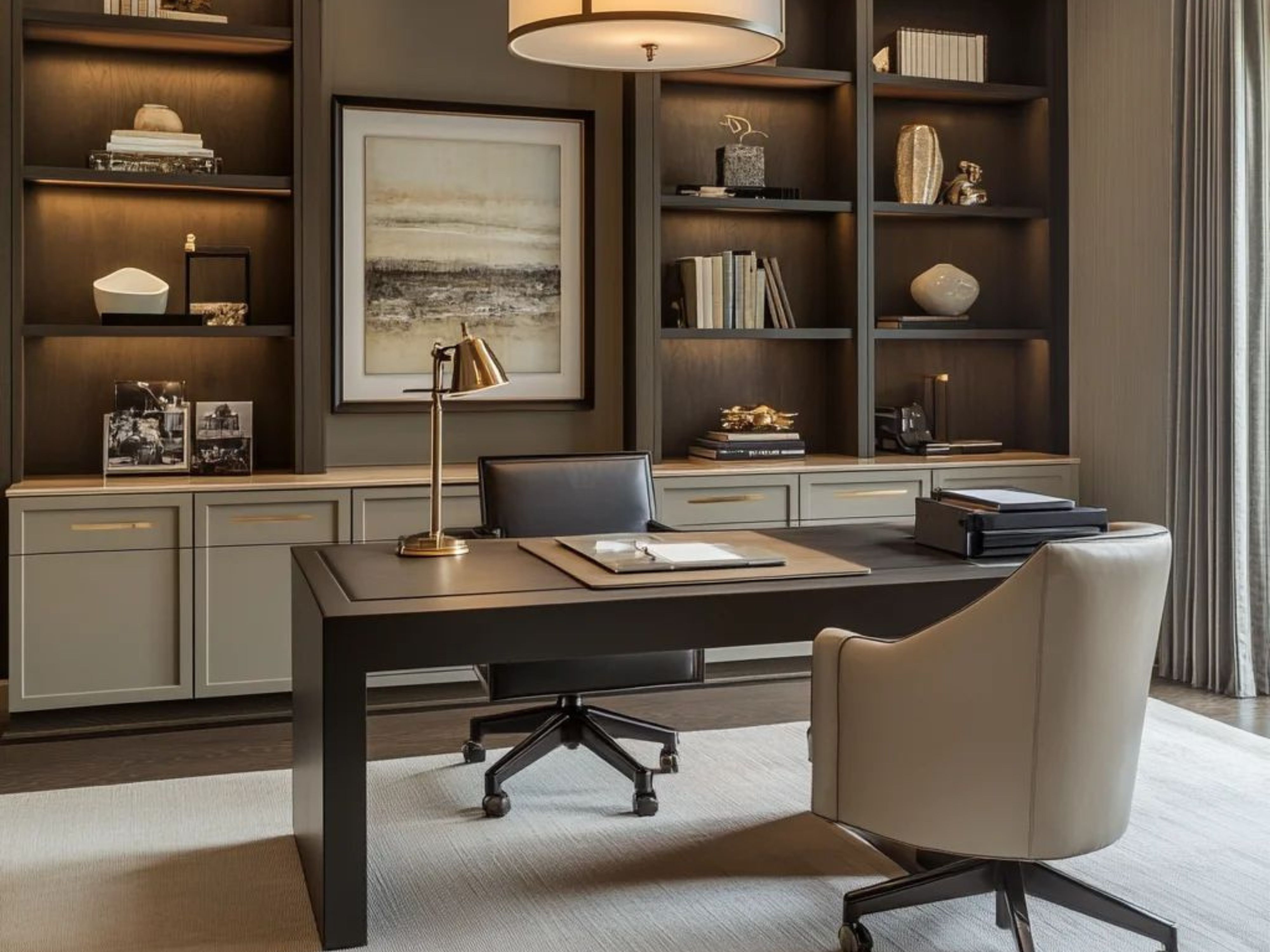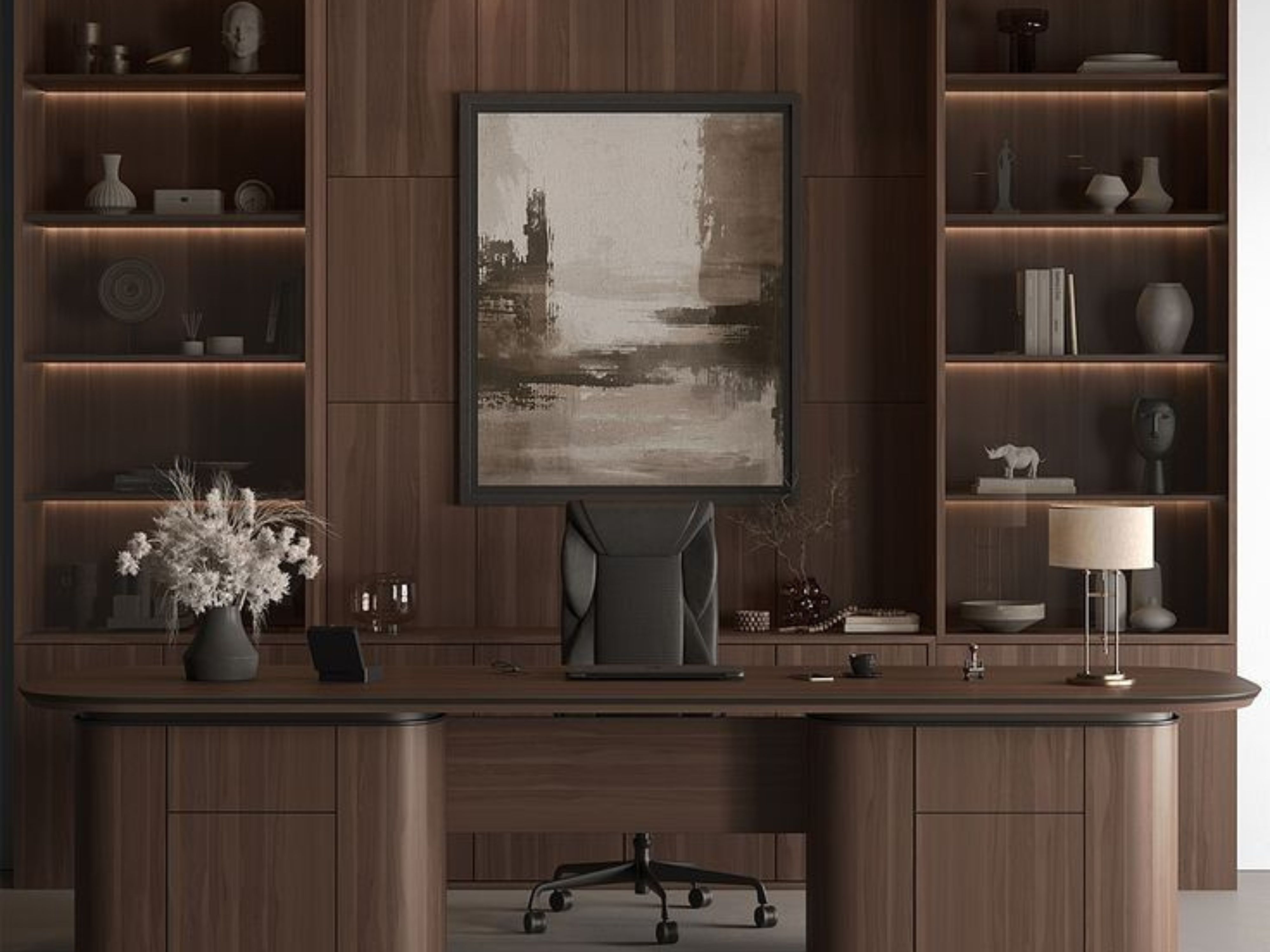 Ánh sáng là một phần không thể thiếu trong thiết kế. Một hệ thống ánh sáng đa tầng giúp căn phòng vừa đủ sáng để làm việc, vừa có những điểm nhấn tạo cảm xúc. Ánh sáng trần mang lại sự cân bằng, ánh sáng bàn hỗ trợ tập trung, trong khi những đèn rọi điểm nhấn có thể làm nổi bật một bức tranh nghệ thuật hay một chiếc cúp danh giá. Nhiệt độ màu nên linh hoạt: ánh sáng ấm khi tiếp khách, ánh sáng trắng khi cần tập trung vào công việc. Kết hợp cùng bảng màu trung tính sang trọng, điểm xuyết bằng sắc đỏ rượu, xanh đậm hay ánh đồng, căn phòng sẽ toát lên vẻ quyền lực nhưng không phô trương.