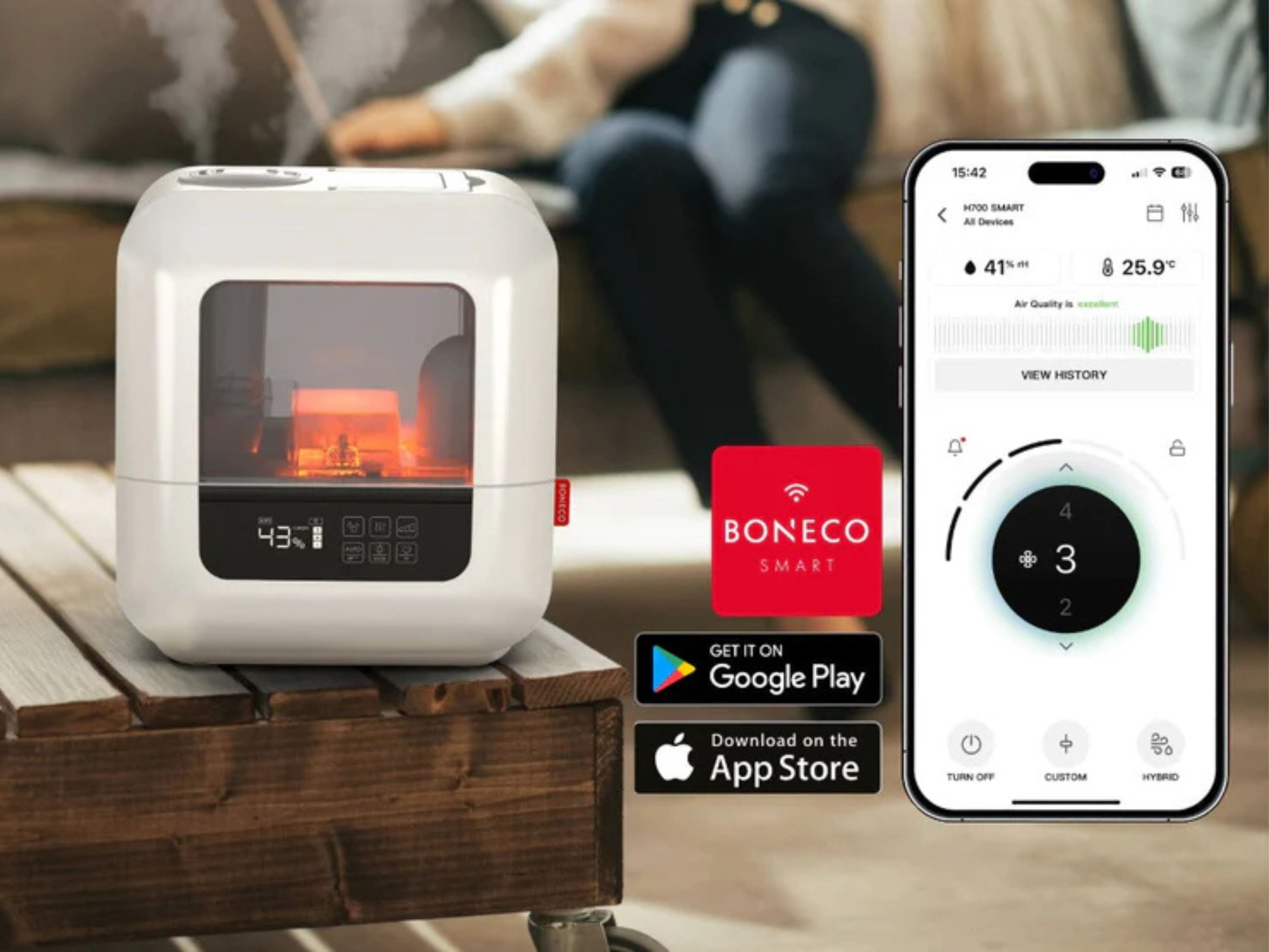Máy tạo ẩm BONECO U700 SMART mang đến trải nghiệm điều khiển hoàn toàn khác biệt nhờ khả năng kết nối Wi-Fi và quản lý toàn diện thông qua ứng dụng BONECO App. Thay vì phải thao tác trực tiếp trên thân máy như trước đây, người dùng có thể theo dõi và tùy chỉnh mọi chế độ hoạt động: công suất phun sương, hẹn giờ, lựa chọn sương mát hoặc sương ấm, thậm chí xem mức độ ẩm trong phòng ngay trên điện thoại. Điều này đặc biệt hữu ích khi bạn đang ở phòng khác, đang bận chăm sóc trẻ nhỏ hoặc muốn duy trì độ ẩm ổn định xuyên suốt cả ngày.